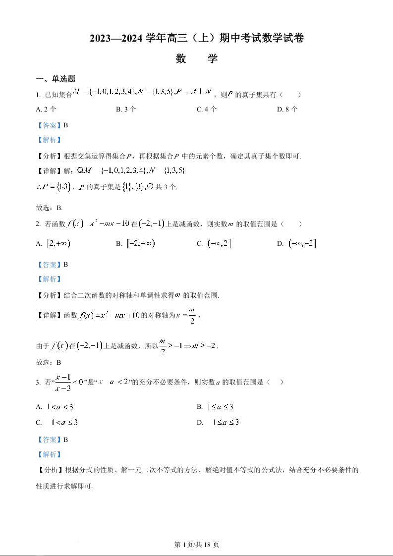 福建省厦门市湖滨中学2023-2024学年高三上学期期中考试 数学答案