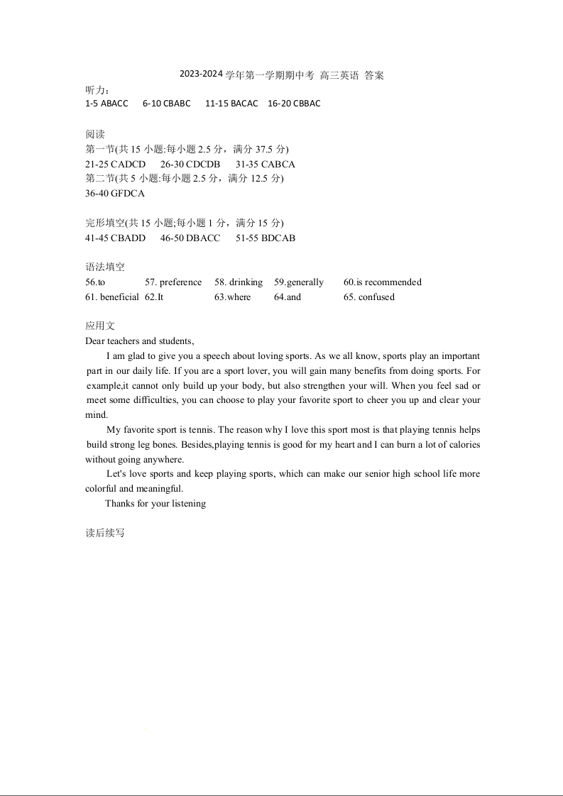 福建省厦门市湖滨中学2023-2024学年高三上学期期中考试 英语答案