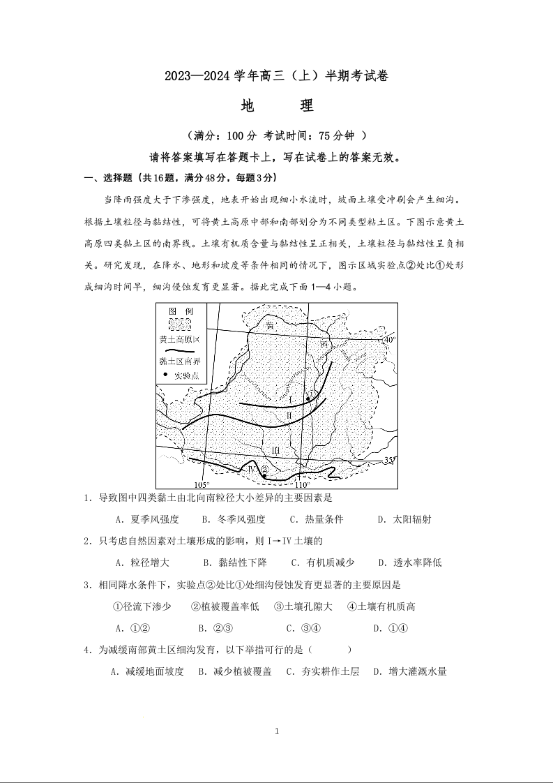 福建省厦门市湖滨中学2023-2024学年高三上学期期中考试 地理