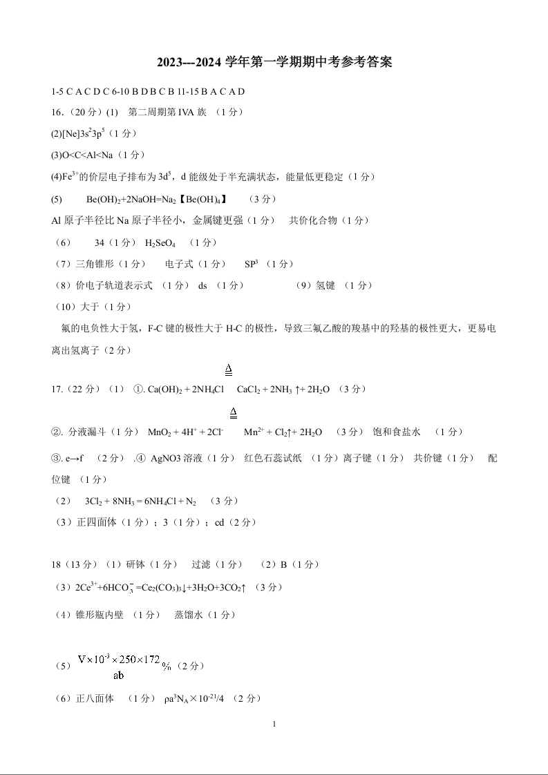 福建省厦门市湖滨中学2023-2024学年高三上学期期中考试 化学答案
