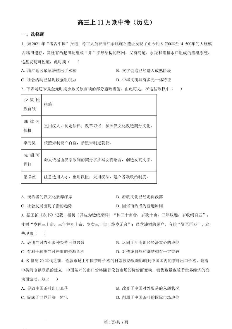 福建省厦门市湖滨中学2023-2024学年高三上学期期中考试 历史