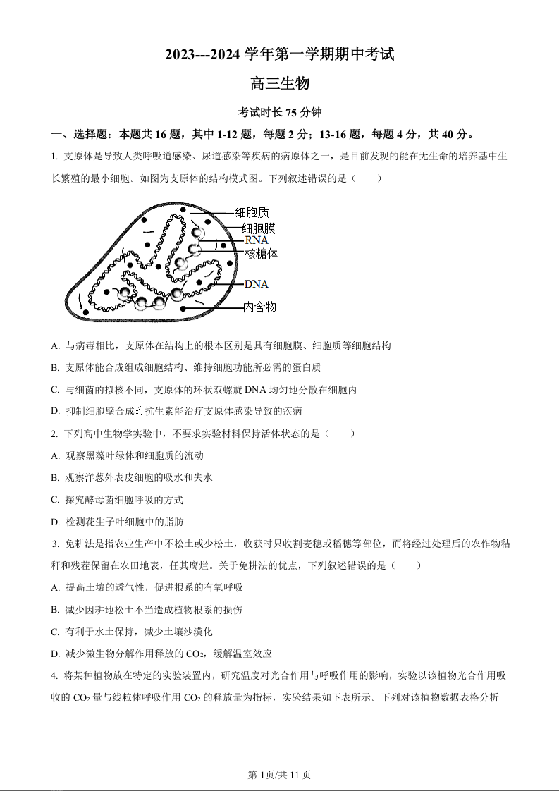 福建省厦门市湖滨中学2023-2024学年高三上学期期中考试 生物