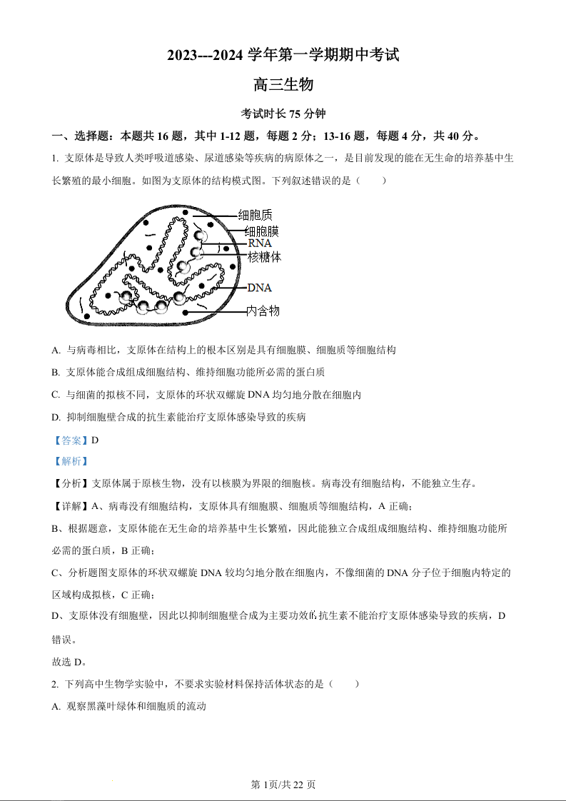 福建省厦门市湖滨中学2023-2024学年高三上学期期中考试 生物答案