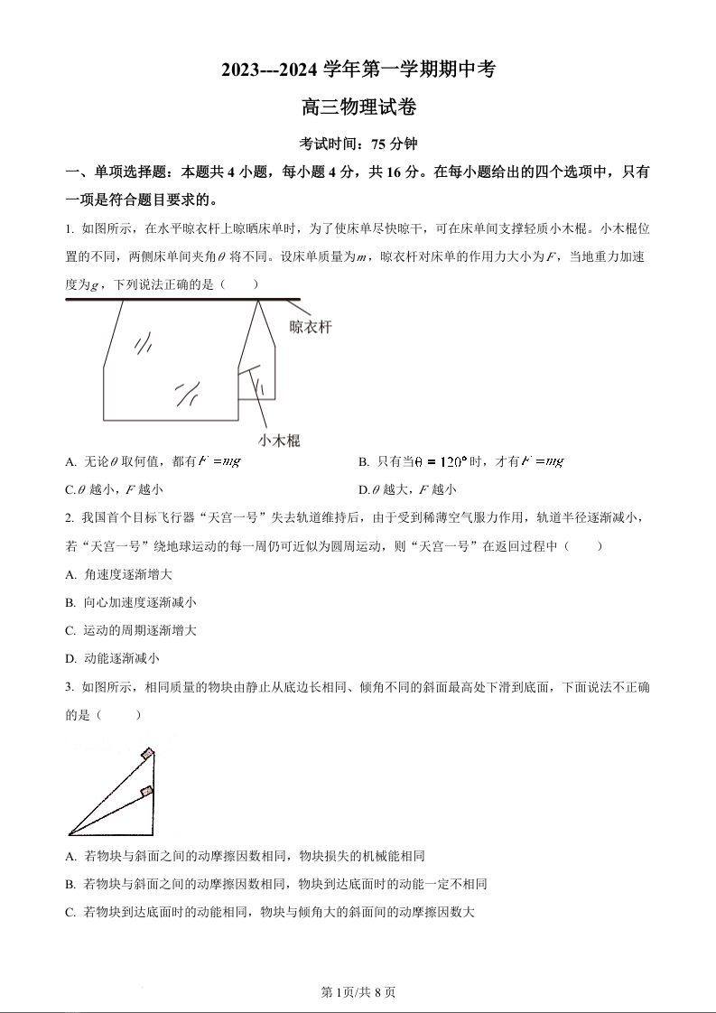 福建省厦门市湖滨中学2023-2024学年高三上学期期中考试 物理