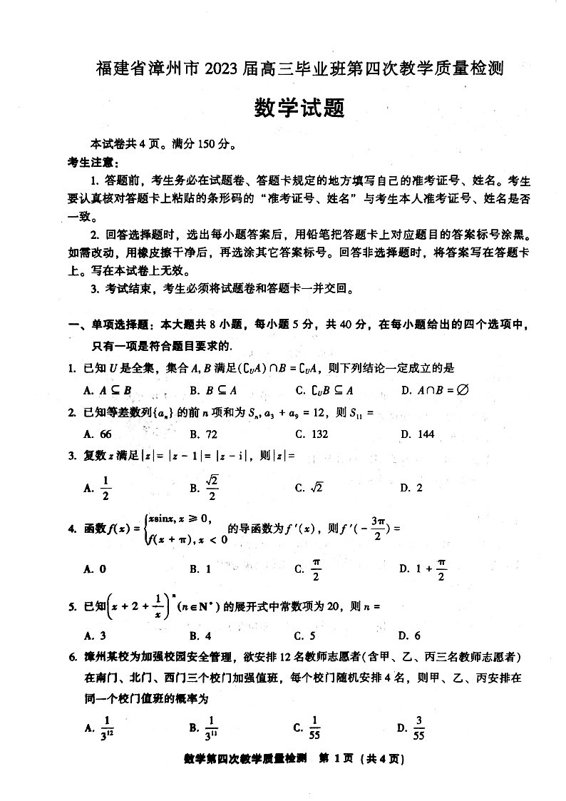 福建省漳州市2023届高三毕业班第四次教学质量检测 数学