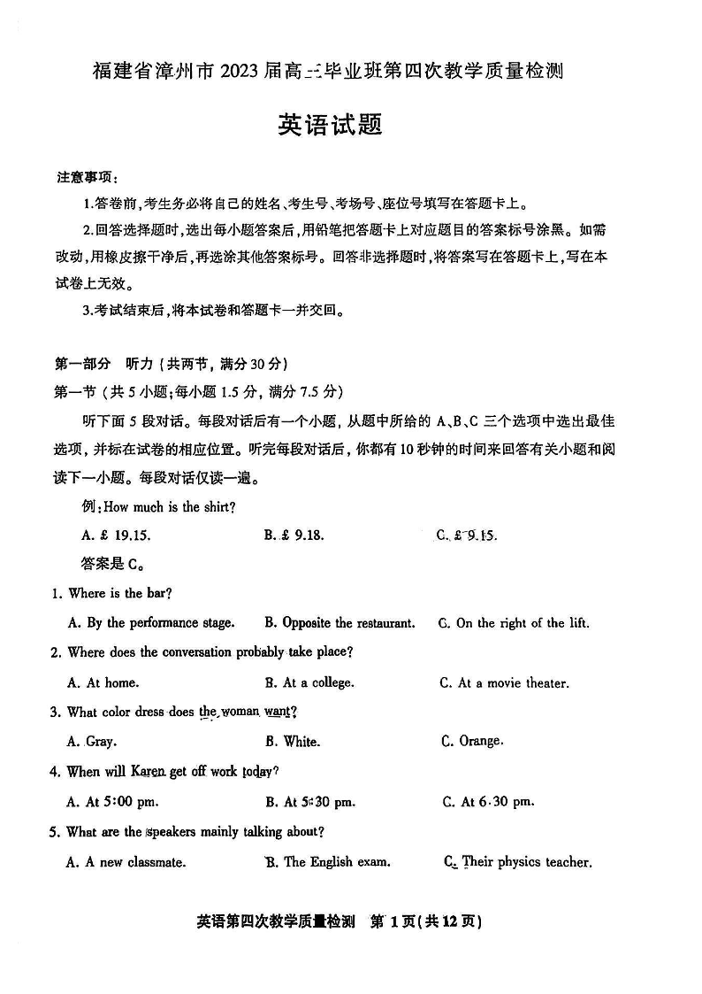 福建省漳州市2023届高三毕业班第四次教学质量检测 英语