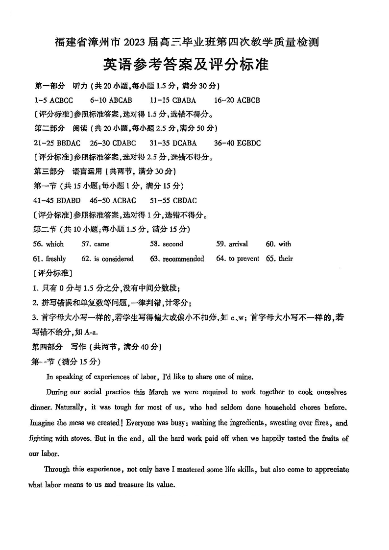 福建省漳州市2023届高三毕业班第四次教学质量检测 英语答案
