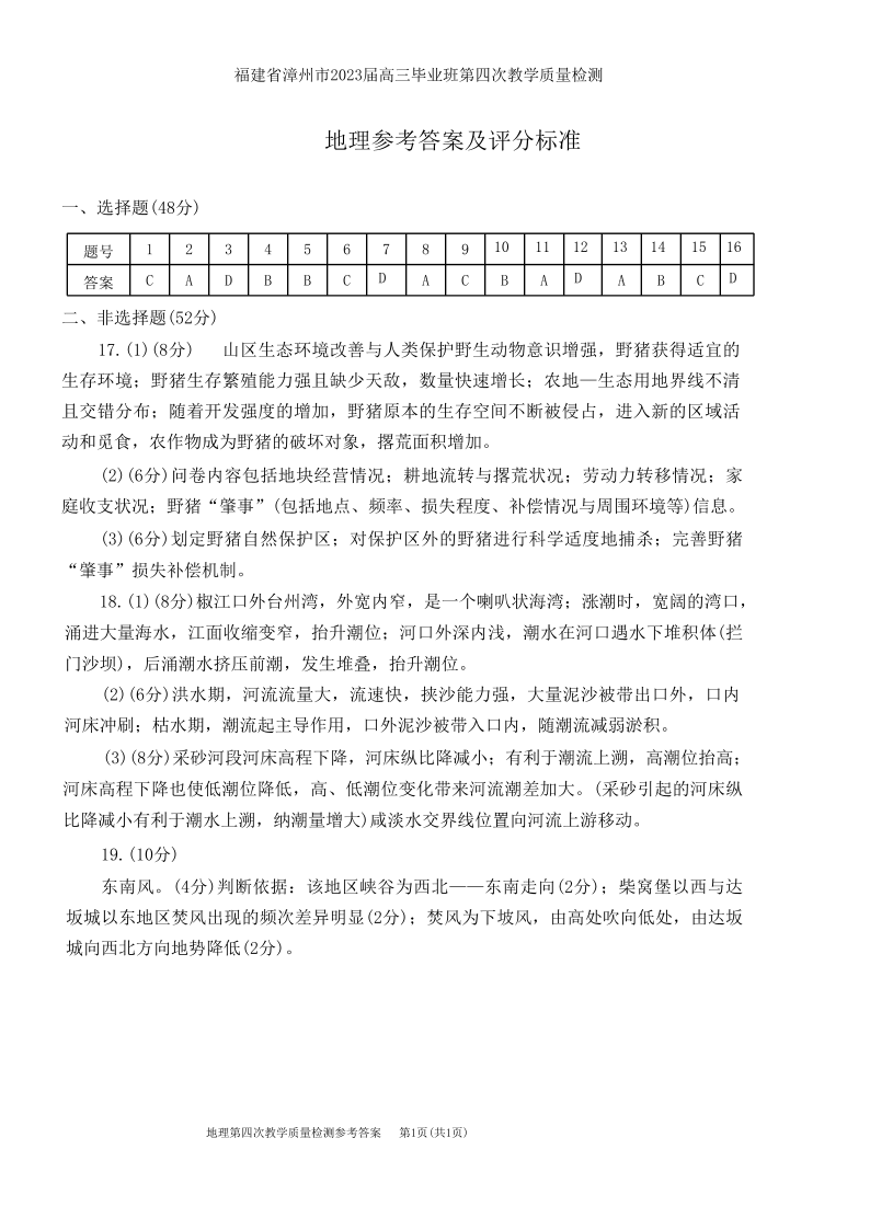 福建省漳州市2023届高三毕业班第四次教学质量检测 地理答案