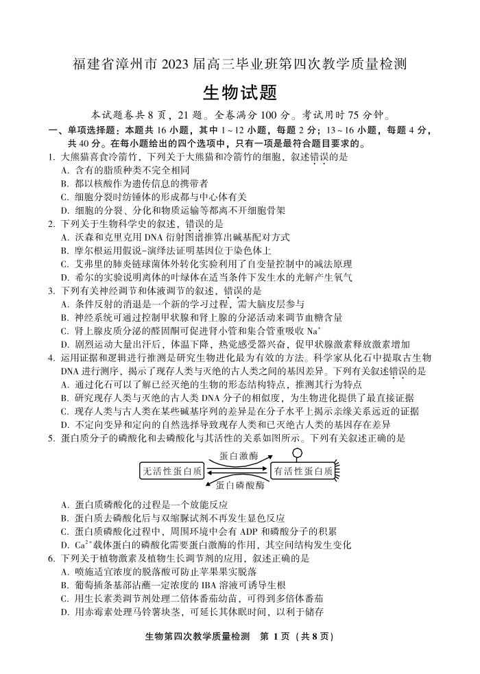 福建省漳州市2023届高三毕业班第四次教学质量检测 生物