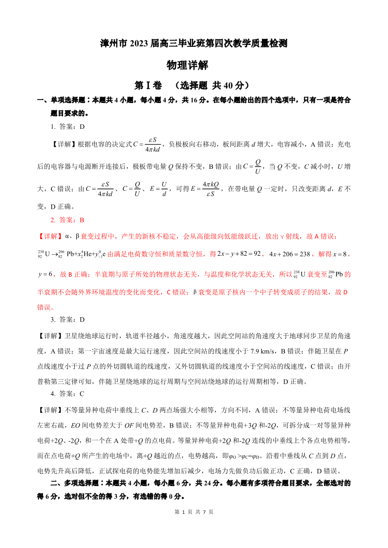 福建省漳州市2023届高三毕业班第四次教学质量检测 物理答案