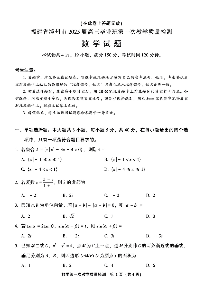 福建省漳州市2025届高中毕业班第一次质量检测+数学