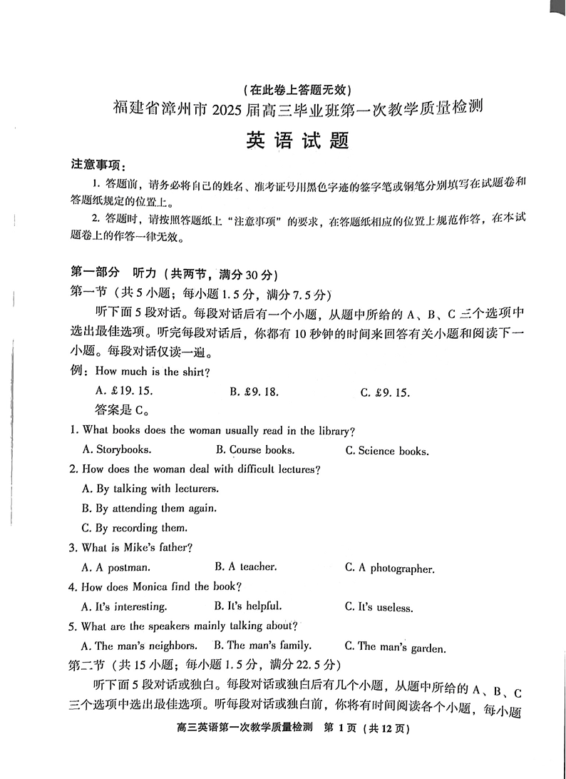 福建省漳州市2025届高中毕业班第一次质量检测+英语