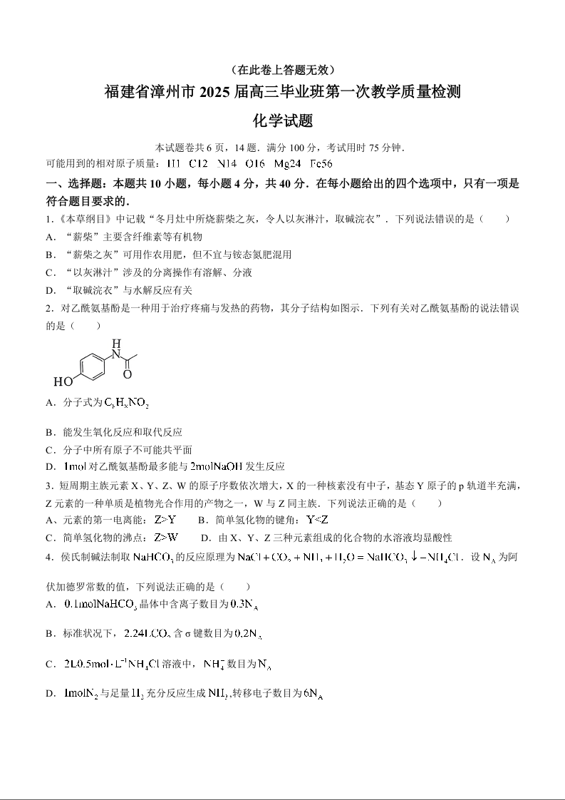 福建省漳州市2025届高中毕业班第一次质量检测+化学