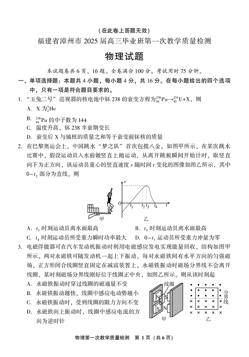 福建省漳州市2025届高中毕业班第一次质量检测+物理