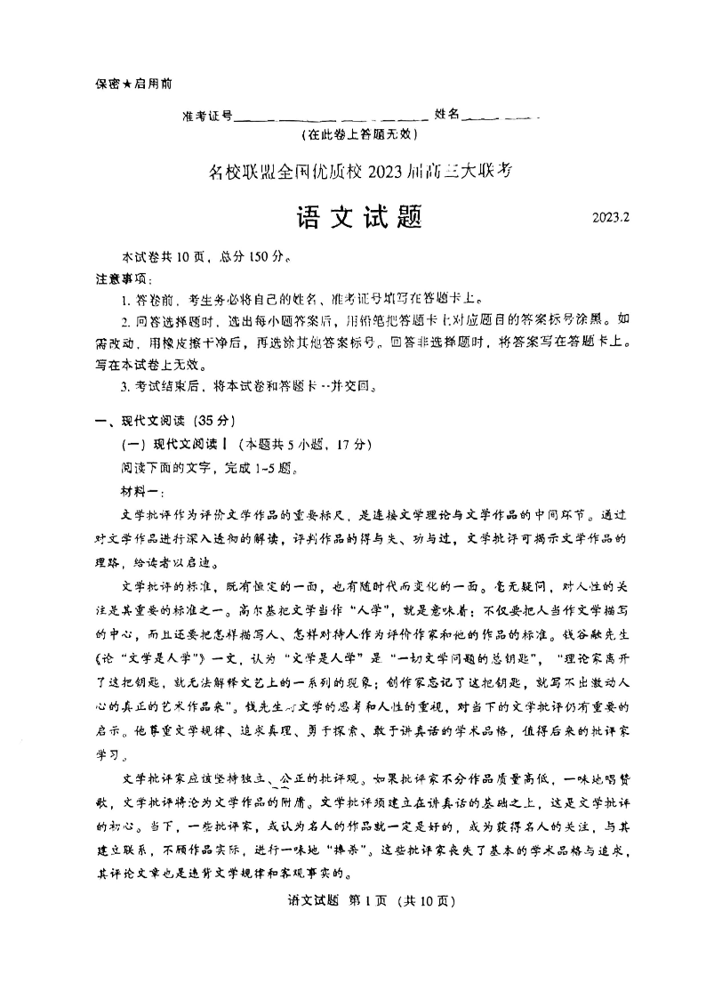 2023届福建省名校联盟全国优质校高三大联考语文试卷
