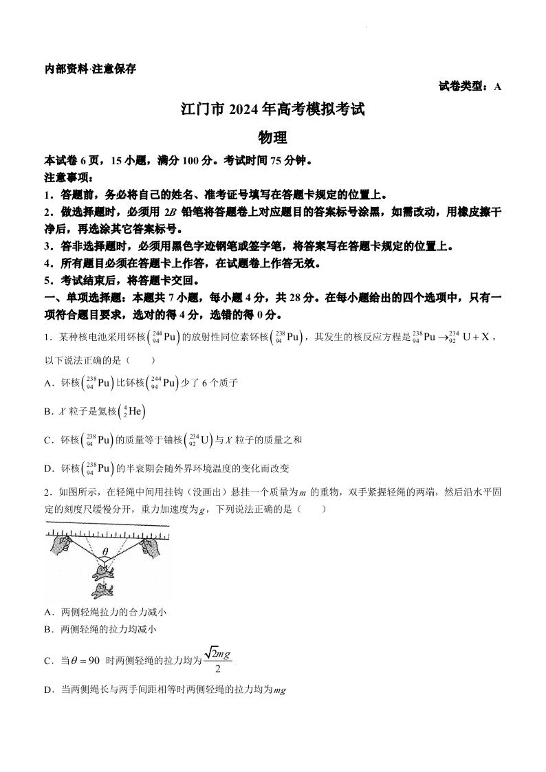 广东省江门市2024年高考模拟考试(一)物理
