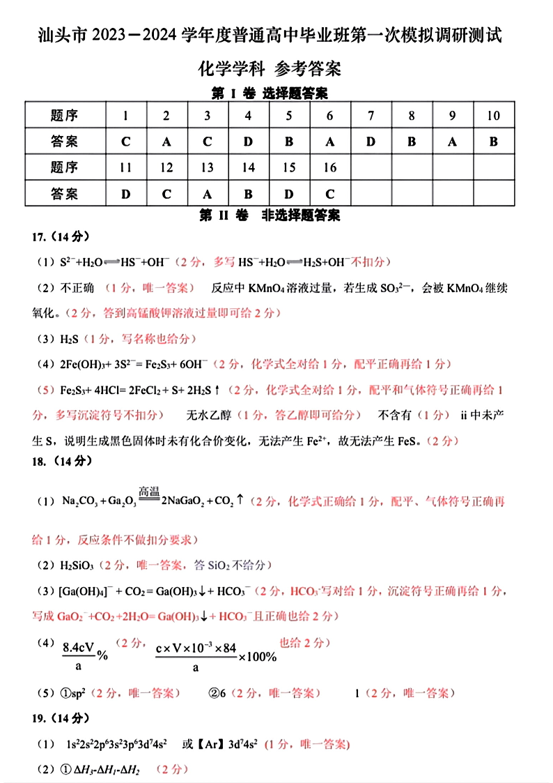 2024届广东省汕头市普通高考第一次模拟考试 化学答案
