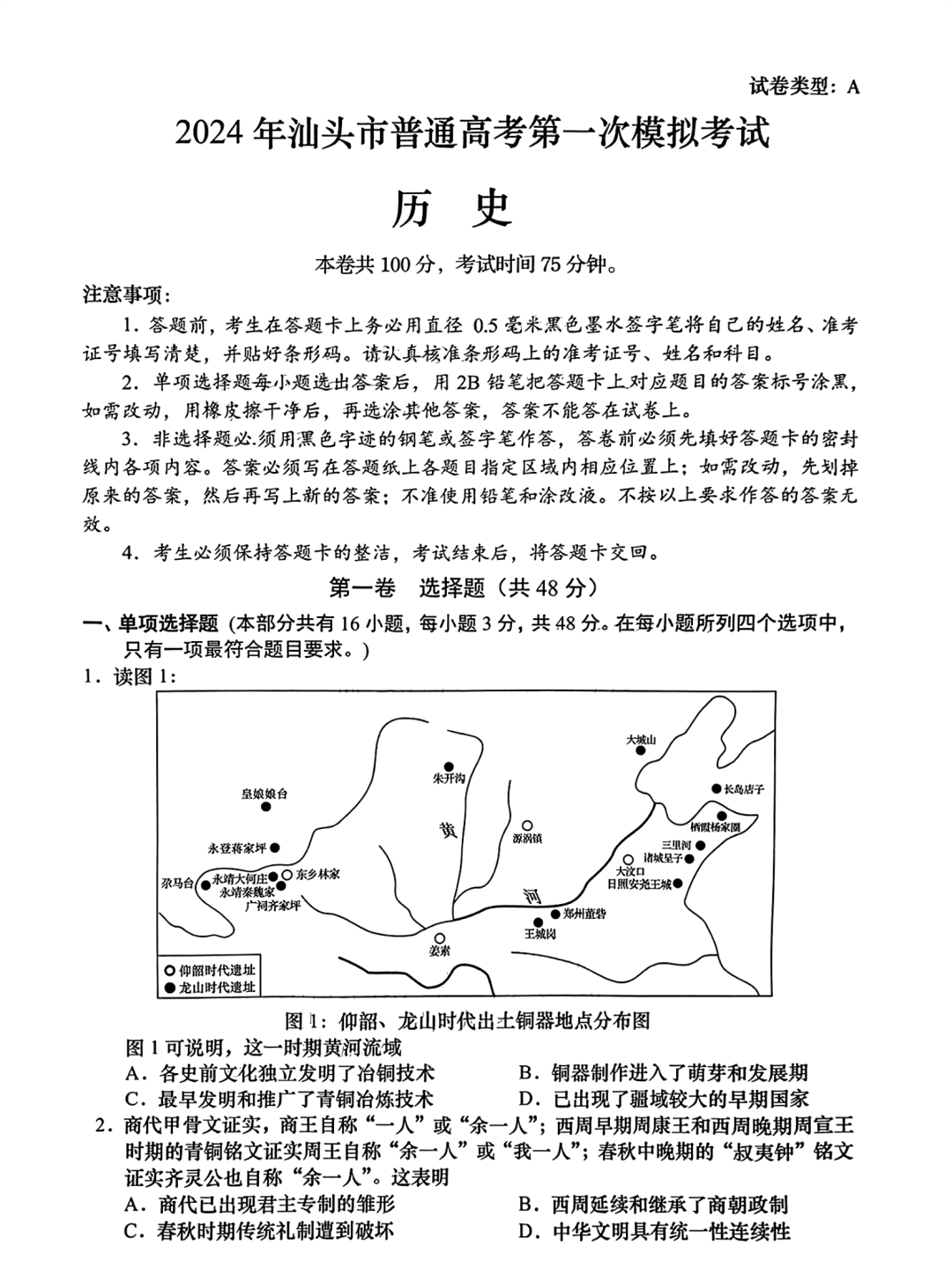 2024届广东省汕头市普通高考第一次模拟考试 历史