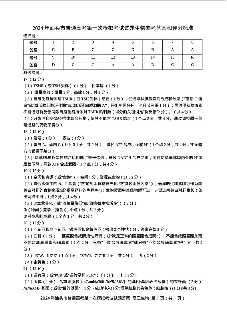 2024届广东省汕头市普通高考第一次模拟考试 生物答案