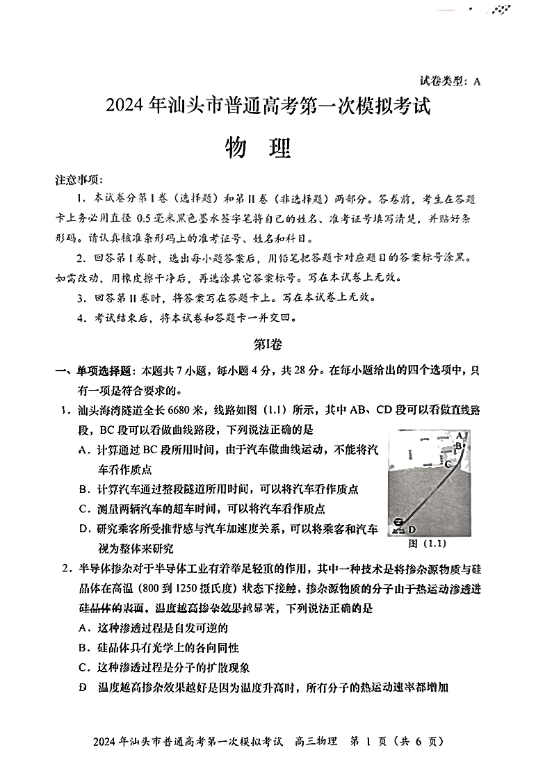 2024届广东省汕头市普通高考第一次模拟考试 物理