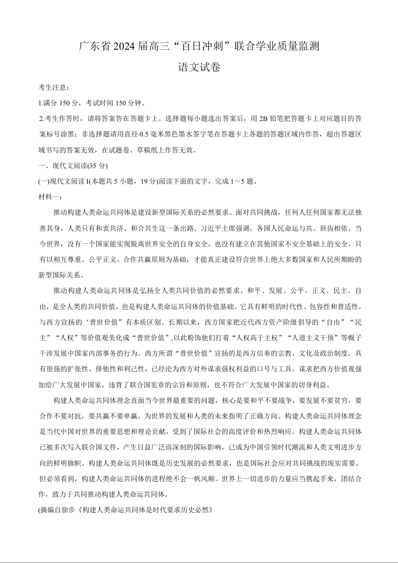 2024届广东省高三“百日冲刺”联合学业质量监测(一模)语文