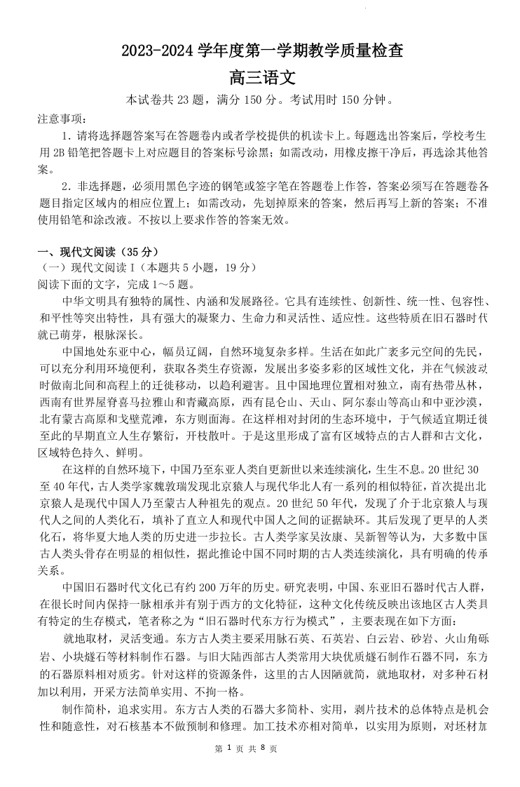 广东省东莞市2023-2024学年高三上学期1月期末教学质量检查 语文