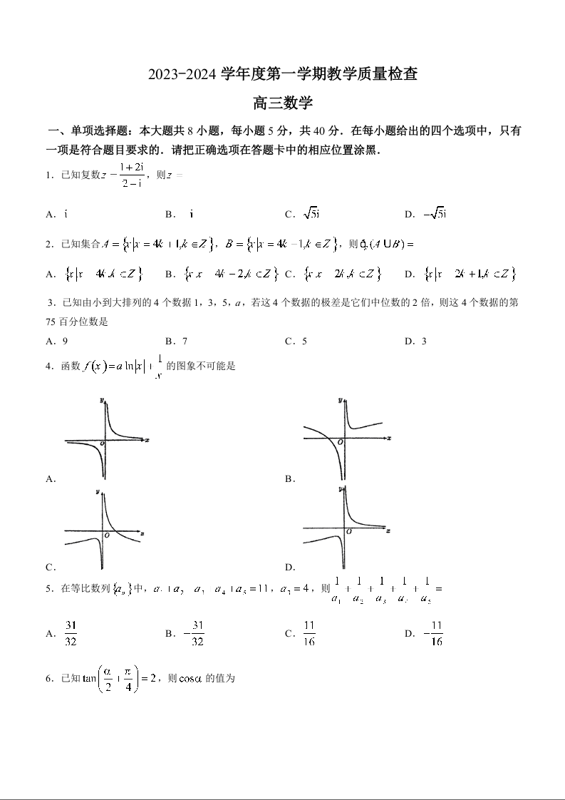 广东省东莞市2023-2024学年高三上学期1月期末教学质量检查 数学
