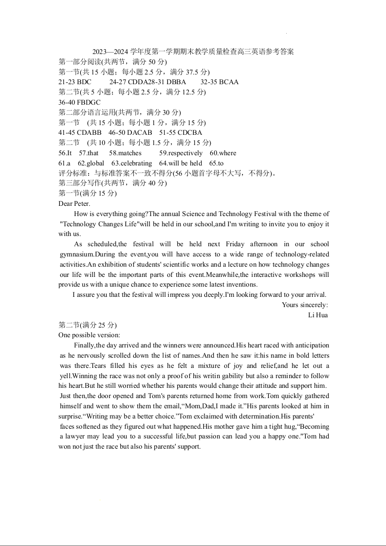 广东省东莞市2023-2024学年高三上学期1月期末教学质量检查 英语答案
