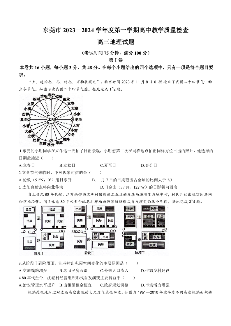 广东省东莞市2023-2024学年高三上学期1月期末教学质量检查 地理