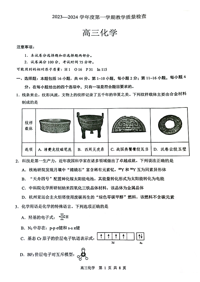 广东省东莞市2023-2024学年高三上学期1月期末教学质量检查 化学