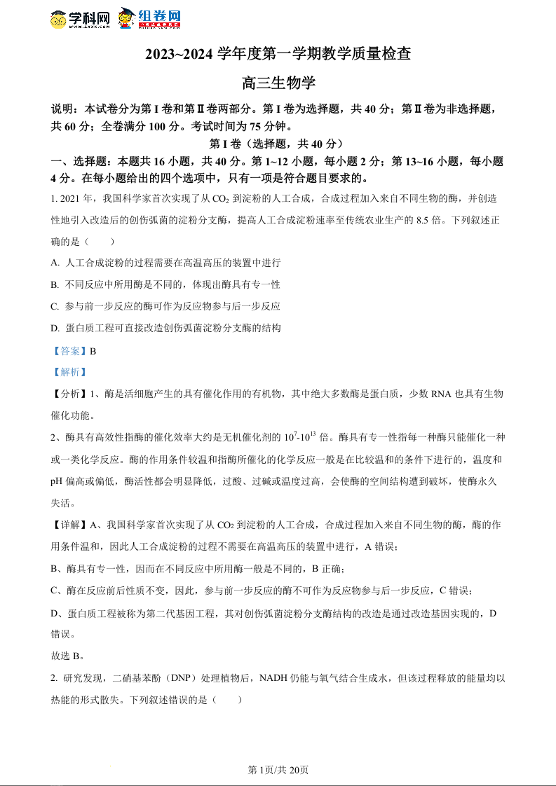 广东省东莞市2023-2024学年高三上学期1月期末教学质量检查 生物答案