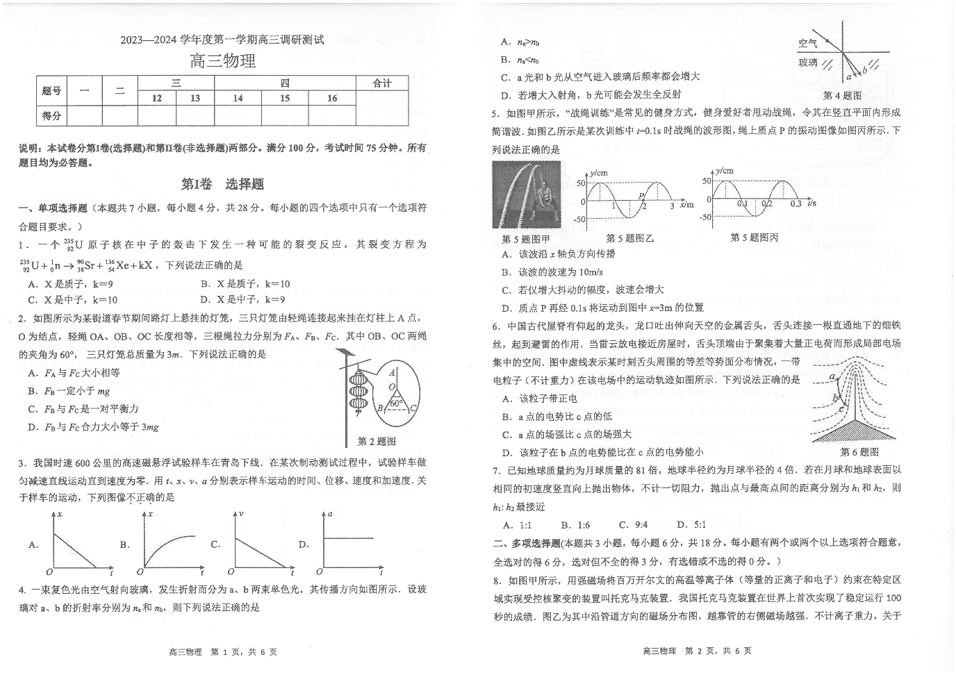 广东省东莞市2023-2024学年高三上学期1月期末教学质量检查 物理