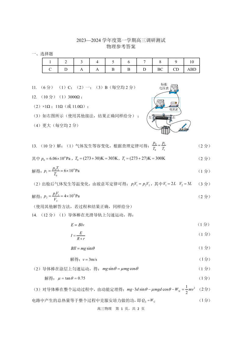 广东省东莞市2023-2024学年高三上学期1月期末教学质量检查 物理答案