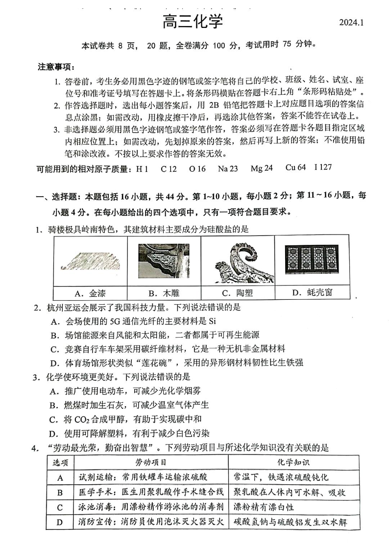 2024届广东省佛山市高三上学期普通高中教学质量检测(一)化学