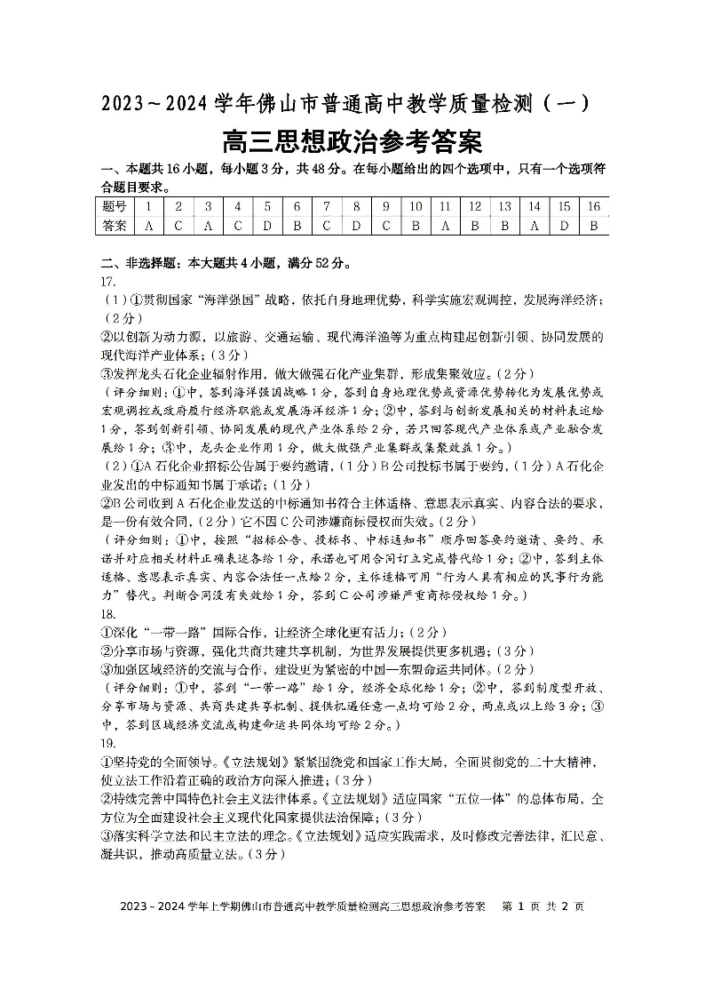 2024届广东省佛山市高三上学期普通高中教学质量检测(一)政治答案