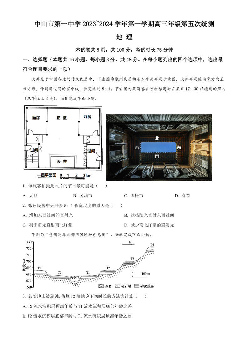 广东省中山市第一中学2023-2024学年高三上学期第五次统测试题 地理