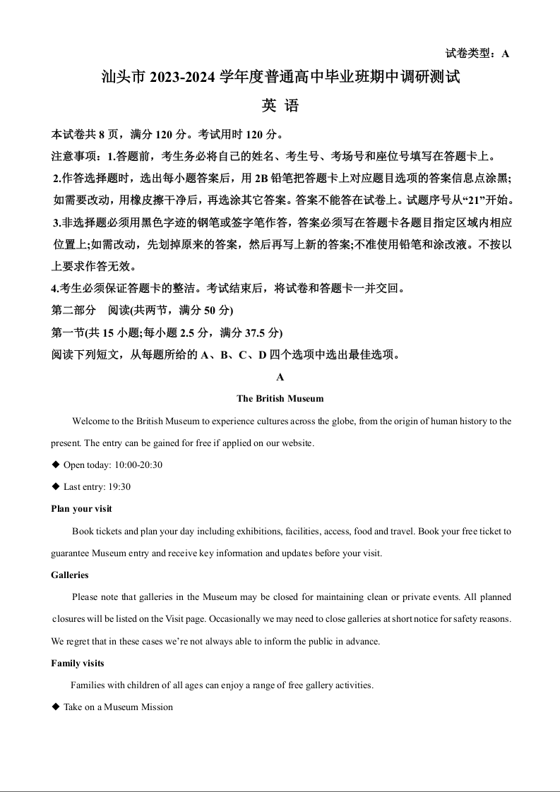 广东省汕头市2023-2024学年高三上学期12月期中考试 英语