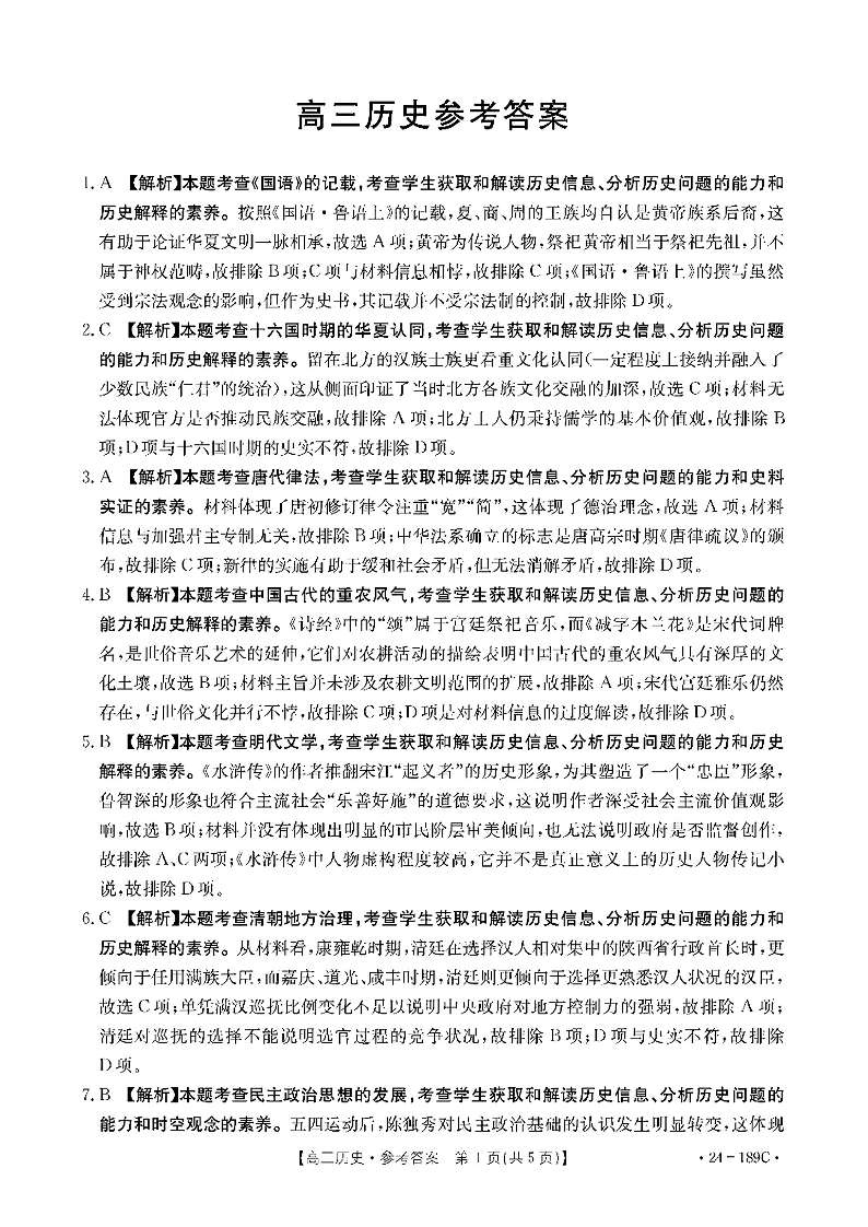 广东省部分学校2023-2024学年高三上学期12月联考 历史参考答案