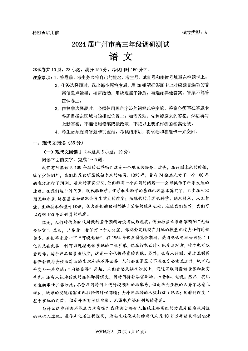 2024届广东省广州市高三上学期12月调研考试(零模)语文
