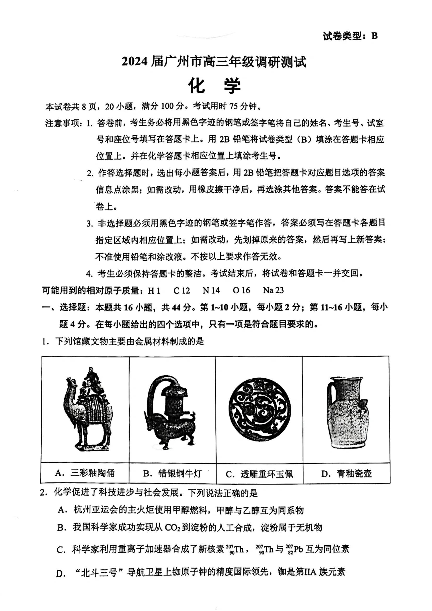 2024届广东省广州市高三上学期12月调研考试(零模)化学