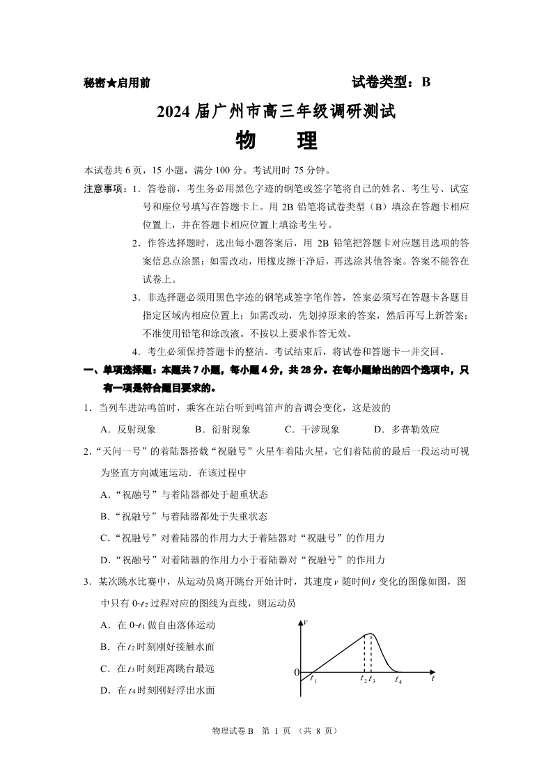 2024届广东省广州市高三上学期12月调研考试(零模)物理