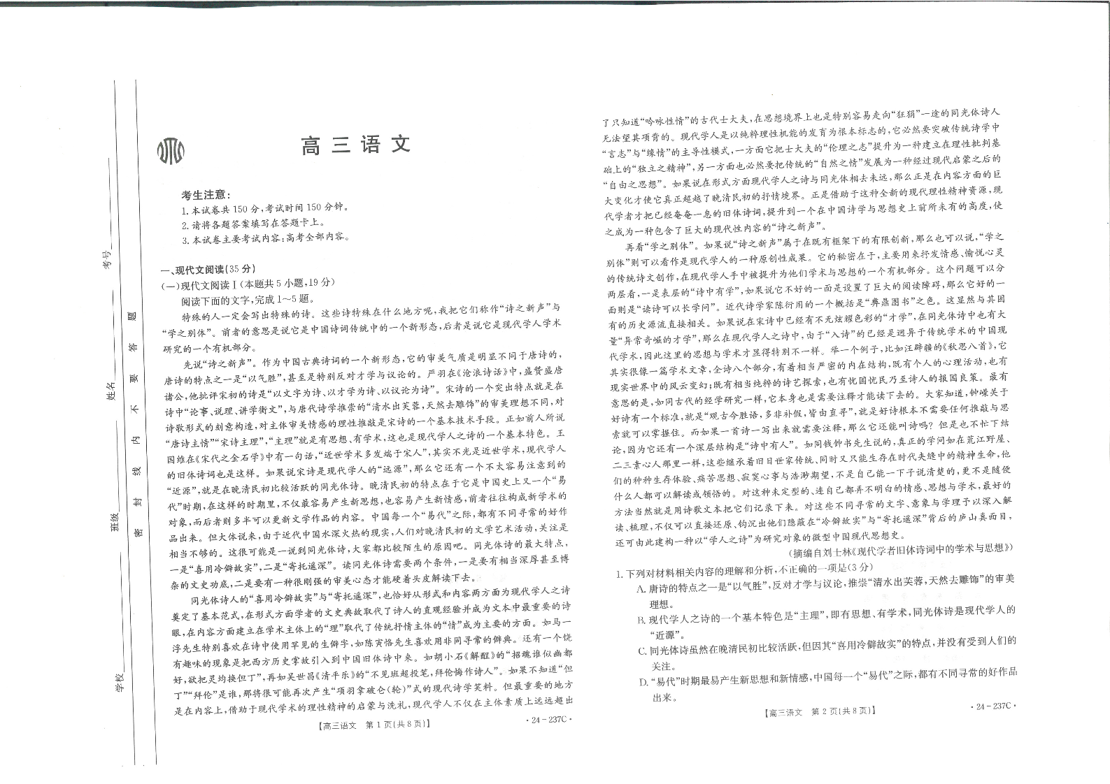 广东省部分名校2023-2024学年高三上学期12月联合质量检测 语文