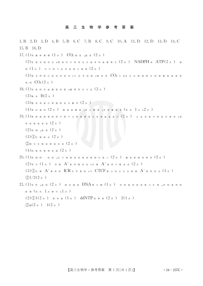 广东省部分名校2023-2024学年高三上学期12月联合质量检测 生物答案