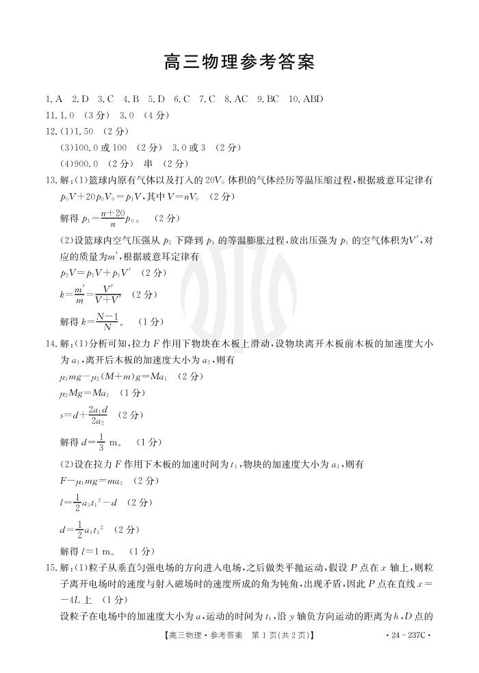 广东省部分名校2023-2024学年高三上学期12月联合质量检测 物理答案
