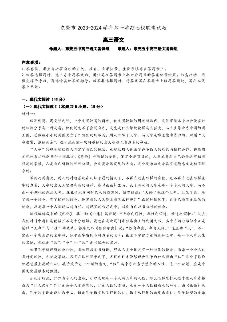 广东省东莞市虎门中学等七校2024届高三上学期联考 语文