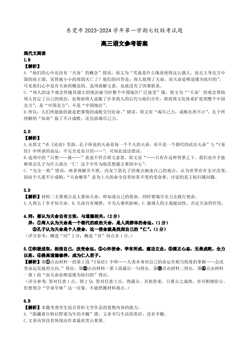广东省东莞市虎门中学等七校2024届高三上学期联考 语文答案