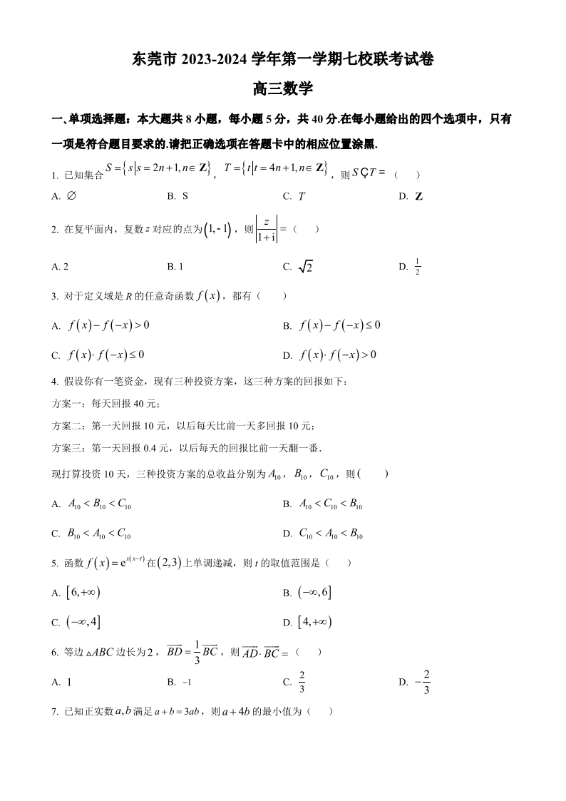广东省东莞市虎门中学等七校2024届高三上学期联考 数学