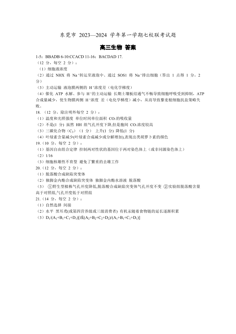 广东省东莞市虎门中学等七校2024届高三上学期联考 生物答案