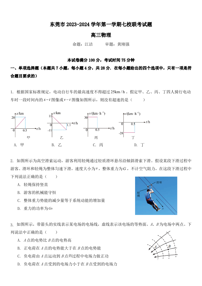 广东省东莞市虎门中学等七校2024届高三上学期联考 物理