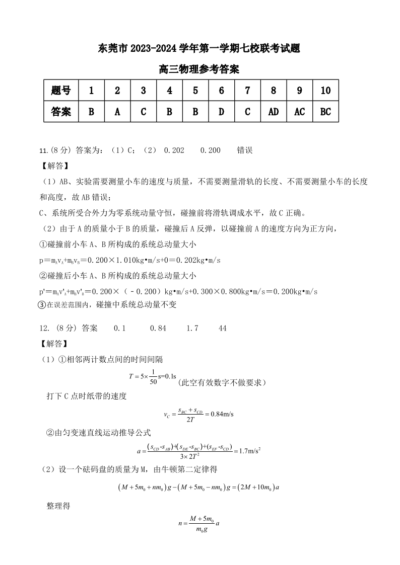 广东省东莞市虎门中学等七校2024届高三上学期联考 物理答案